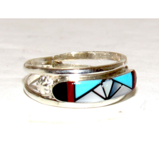 Vintage Zuni Coral Turquoise Inlay Band Ring Size 7 Sterling Silver
