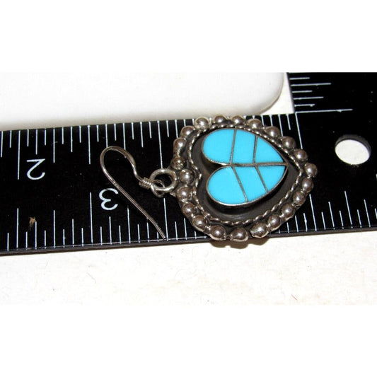 Zuni Turquoise Inlay & Sterling Silver Heart Dangle Earrings Faye Lowsayatee